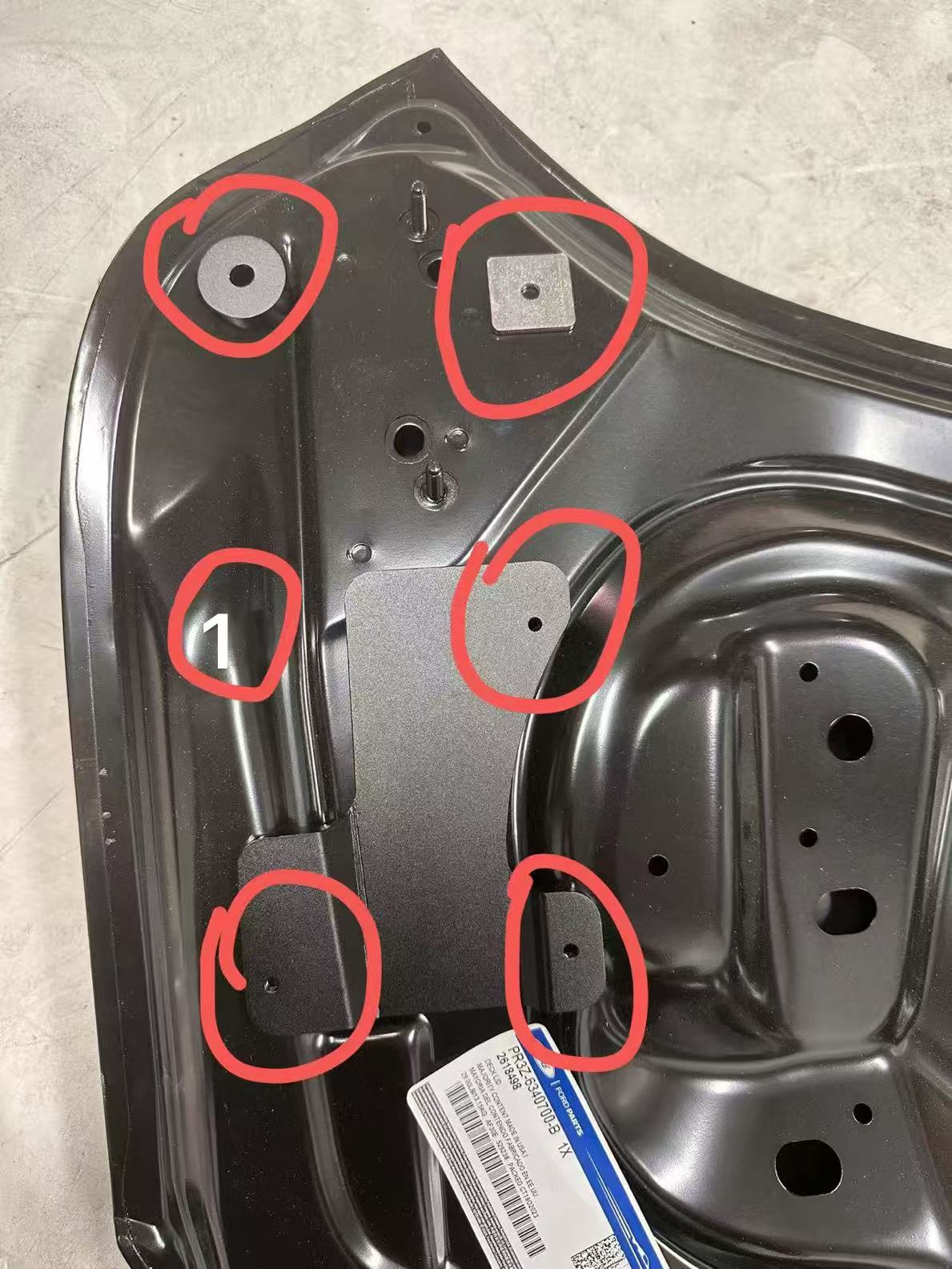 Where we’ve marked "1", you’ll need to widen that hole to fit a bolt and nut through. This is the only fixing point that goes through a single layer. All other points are bolted through two layers.