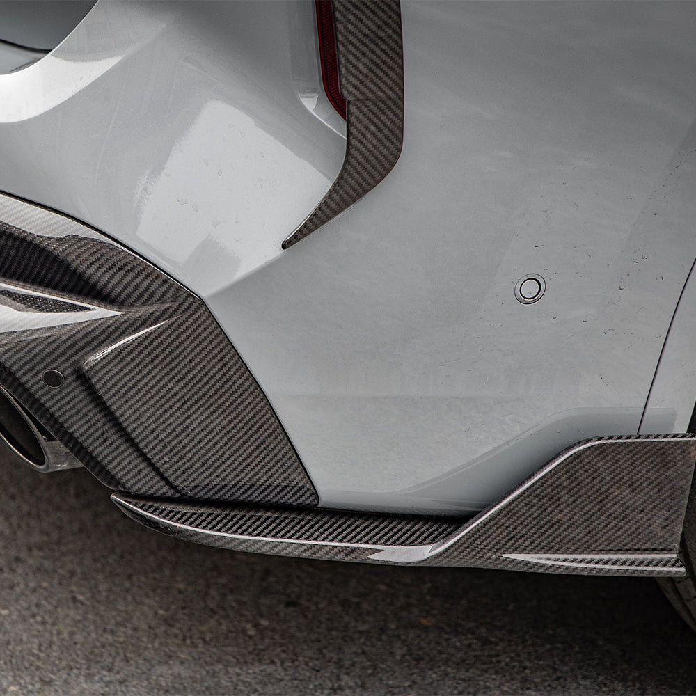 SOOQOO BMW X3M F97 LCI 2023+ rear diffuser. Made from prepreg carbon fiber, unique design, perfect fitment and the best UV protection clear coat that can be used for over 3 years without any reaction. 1-year free warranty.